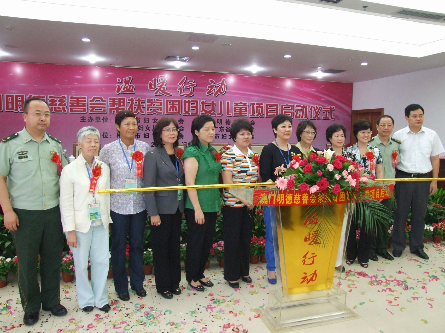 行動-澳門明德慈善會幫扶貧困婦女兒童項目啟動儀式」在梅州興寧市會展中心會議室隆重舉行,廣東省婦聯副主席丘瑞清,武警廣東總隊醫院院長廖賢平、心臟外科主任王曉黎,梅州市政府副秘書長林雨蘭,興寧市市長謝勝揚,廣東省婦女兒童基金會秘書長胡碧蓮,以及明德慈善會領導和各界嘉賓,共二百多人出席了今次活動。林雨蘭、廖賢平、羅香珠、李雪屏、丘瑞清等領導和嘉賓,分別作了熱情洋溢的講話。啟動儀式上,周淑儀、崔小碧代表明德慈善會向廣東省婦女兒童基金會捐贈人民幣三百萬元支票。